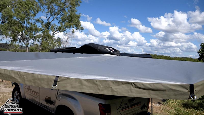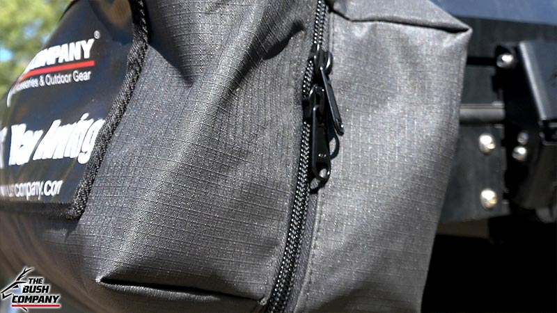 The 270 XT MAX™ Awning is made in South Africa from quality components. The awning bag is 460gsm (16.2oz) poly-cotton rip-stop canvas with YKK Zippers. In contrast to PVC covers, the canvas allows the awning to breath while keeping it dust/dirt free and moisture is able to wick out through the zipper reducing the risk of mold or mildew. The rip-stop material on the bag also reduces the risk of large running tears in the bag as a result of contact with tree branches, and the front and rear sections of the bag have a double layer of canvas providing extra protection. The canvas on the awning itself is a 320gsm (11.3oz) poly-cotton rip-stop canvas in The Bush Company’s traditional olive green color that is mold and mildew resistant. . There is only one seam in the whole canvas section (not including the edges) and the canvas is pre-treated during manufacture for water resistance, but over time if the stitched areas show signs of water ingress this is easily treated with a canvas aqua proof product to seal the stitch holes. Where the canvas is attached to the ends of the trussed awning arms there is additional triple reinforcement to eliminate chafing, while the front and rear arms slide into a triple stitched canvas sleeve.