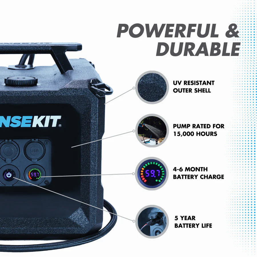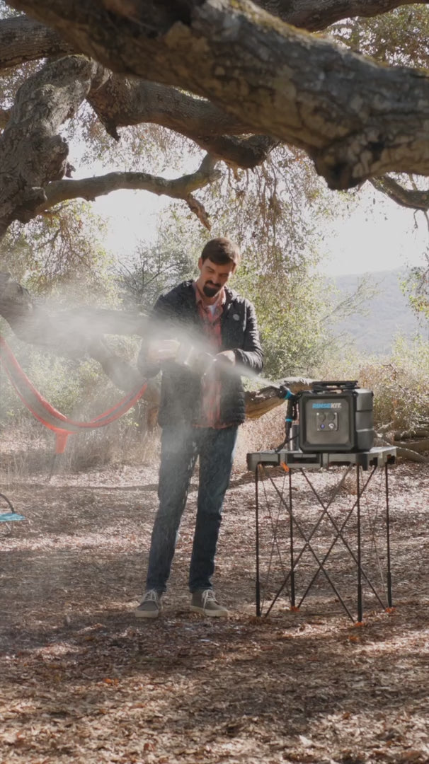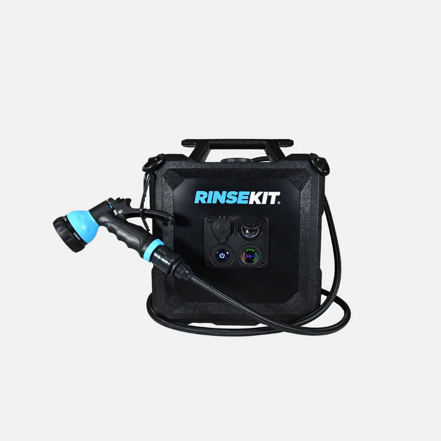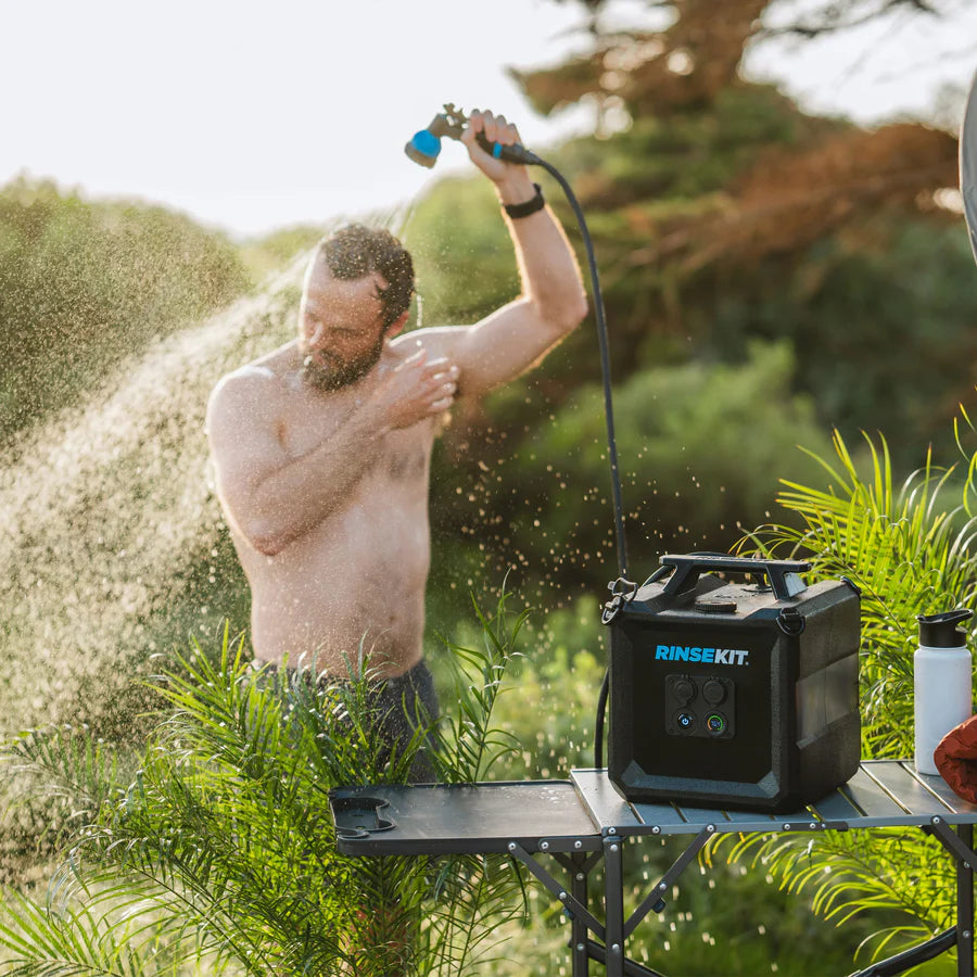 The RinseKit Cube is our 4-gallon Portable Shower that empowers you to clean up wherever adventure takes you. Equipped with battery-powered pressurization, the Cube boasts a consistent high-pressure spray that can blast off the toughest dirt and grime. It's super easy to use - simply pour in water, press the power button and spray. It is built tough with military-grade materials, and is equipped with stainless steel tie-downs for when the road gets rough. The Cube is the strongest, most durable, and intuitive portable shower on the market - made for keeping you clean no matter how far out you go.