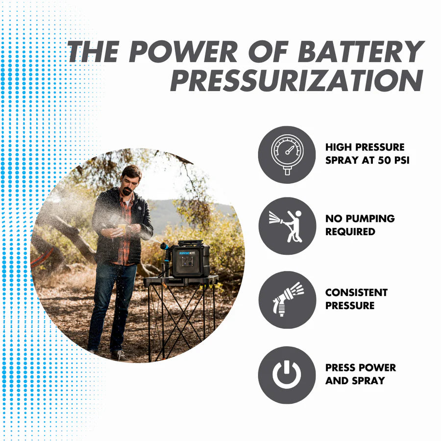 • Battery Powered Pressurization - Have access to pressurized water at the push of a button via an AGM 12v 5Ah battery