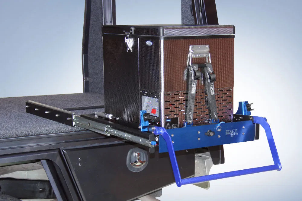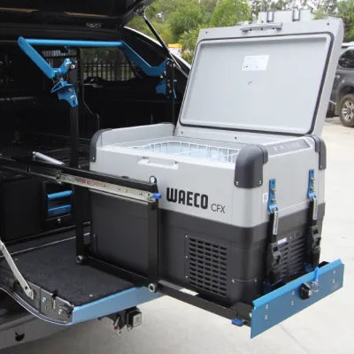 Using the slimline handle, the Drop Slide™ lowers 30 centimetres while extending out further over the tailgate. This happens in one safe, smooth, controlled motion. At the same time, the platform remains in a perfectly horizontal position and avoids contact with the vehicle. The unique MSA 4X4 blue anodised faceplate provides a tough, durable and easily recognisable finish. The frame is constructed from powder-coated steel and the compact design maximises storage space within the vehicle. The MSA 4X4 Drop Slide™ is engineered to be easily installed and the pre-drilled tray holes provide anchor points for most popular fridges. The lock-in, lock-out safety feature locks the slide in its intended position while travelling, preventing potential damage to the fridge and vehicle.