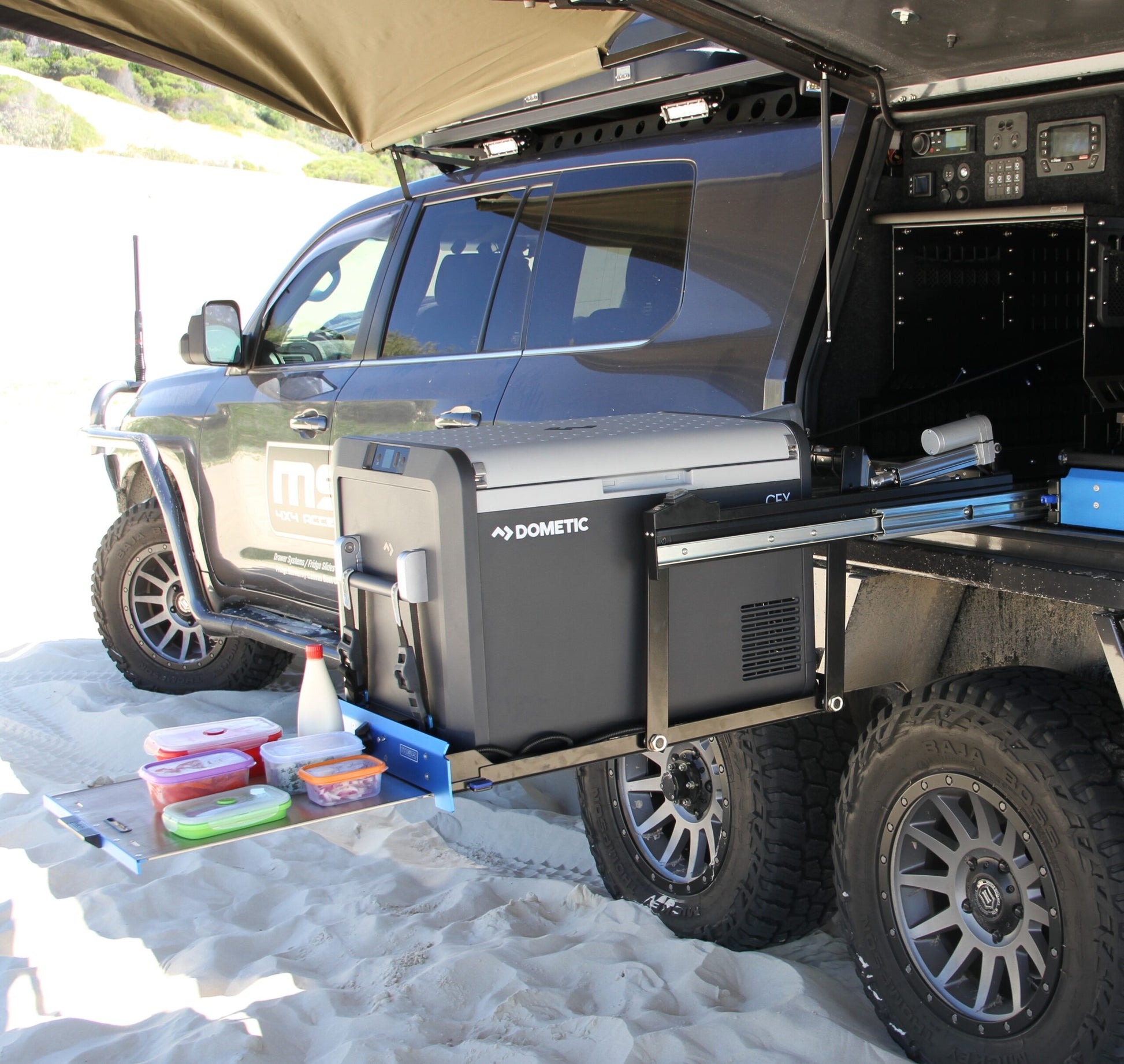 MSA 4X4 has now taken the original Drop Slide™ to the next level and completely removed all physical effort to raise and lower a fridge to an accessible height. Chest style fridges and freezers offer the best solution to store refrigerated goods whilst travelling Australia’s rough roads. Accessing chilled food and drinks needs to be as easy as possible. All physical effort to raise and lower a fridge to an accessible height has been removed. Simply extend the slide and press the right-hand side control panel buttons to lower and raise the fridge. The function is smooth and effortless with the powerful twin 12-volt electric actuators doing all the work. The MSA POWER SLIDE™ shares the same compact footprint as the original patented Drop Slide™. Pre-drilled holes in the tray provide extra convenience in accommodating most popular fridges. It comes with an easily attached, emergency handle to manually raise and lower the slide in case of an electrical failure. Built extremely tough and comes with a Lifetime Guarantee on the slide and 3 Year Warranty on the actuators.