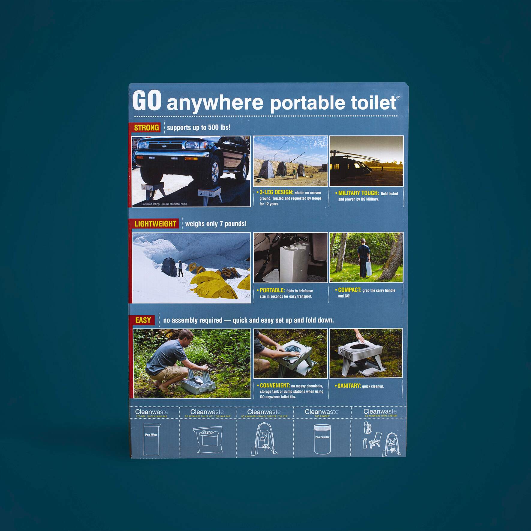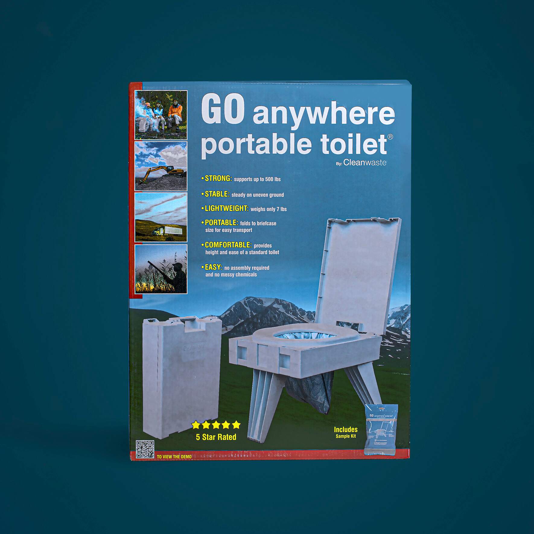 Enjoy dignified convenience with our safe, sturdy, thoughtfully engineered, premium-quality GO Anywhere Portable Toilet®. Our compact toilet weighs just 7 pounds, and folds closed to standard briefcase size. It provides the comfort, height, and ease of use of a standard toilet, supports up to 500 pounds, and is stable on uneven ground. No mixing, messy chemical waste storage tanks or dump stations required. No assembly required. Use it, seal it, and toss it in the trash.