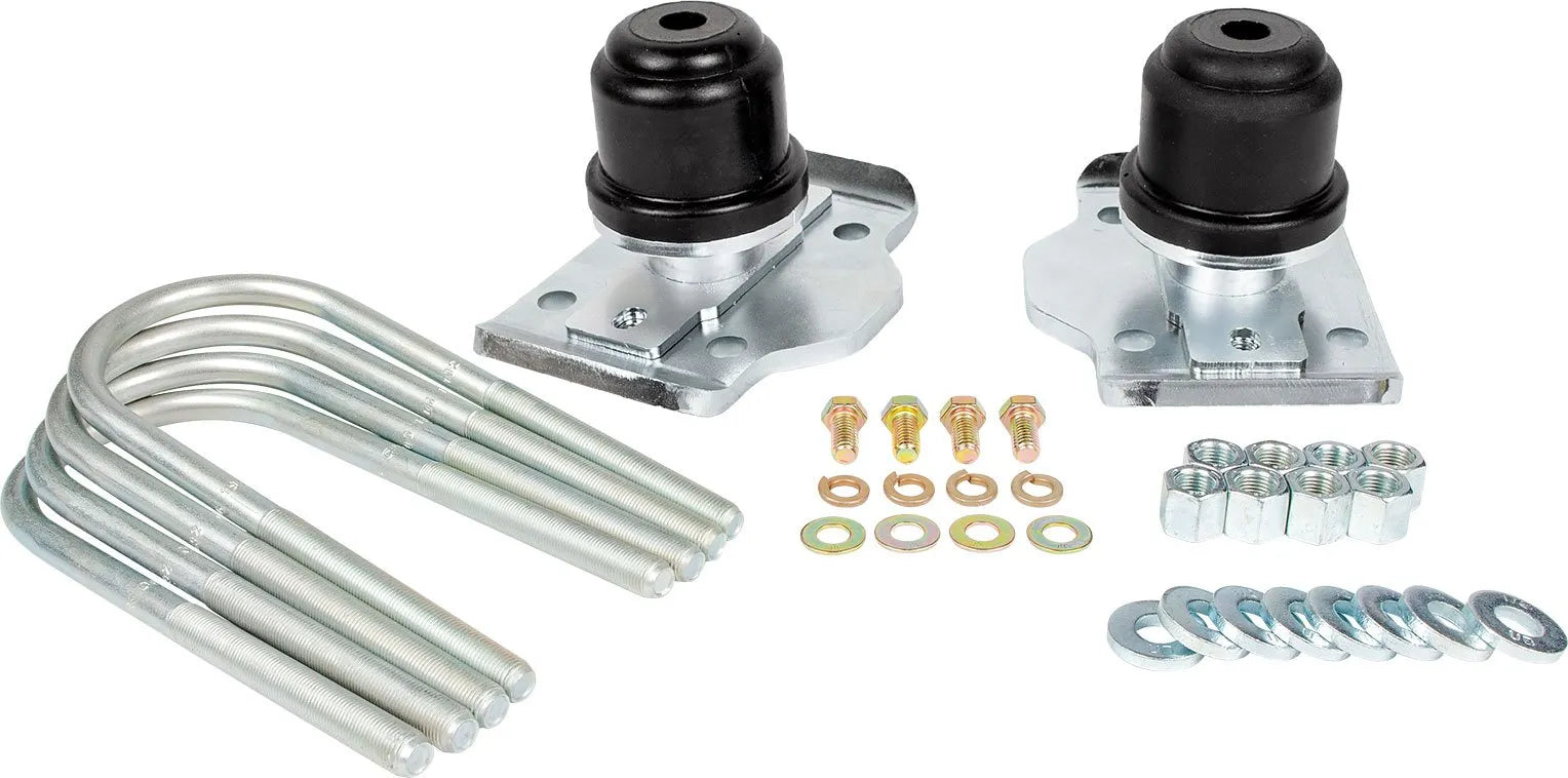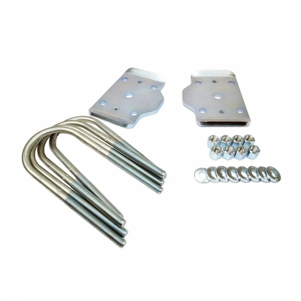 This Wheeler's kit flips your u-bolts for increased rear ground clearance and protection of your u-bolt threads. The plates are drilled and tapped for mounting a cushion type bump stop such as our SuperBumps or they have a kick-out for use with a frame-mounted hydraulic or air bump system to contact.