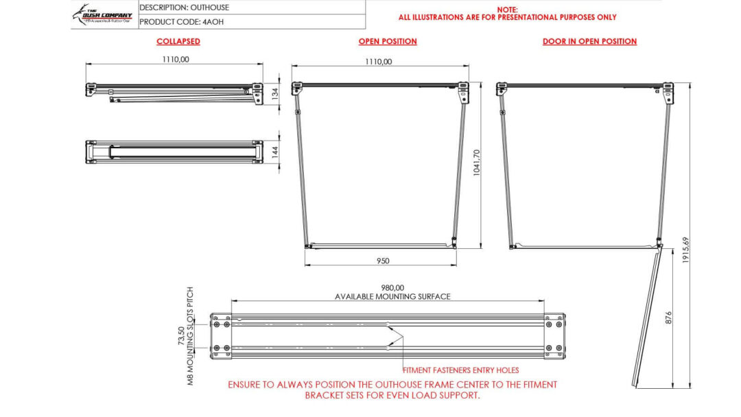 The Outhouse can be easily mounted to roof racks using our Low Profile L Bracket, or to the side of your rooftop tent using the Outhouse To Tent Bracket. *These brackets must be ordered separately as they are not included with the Outhouse and are designed for use with The Bush Company tent bodies.