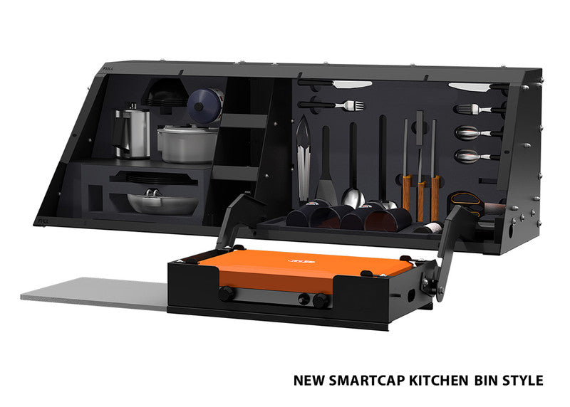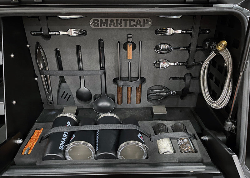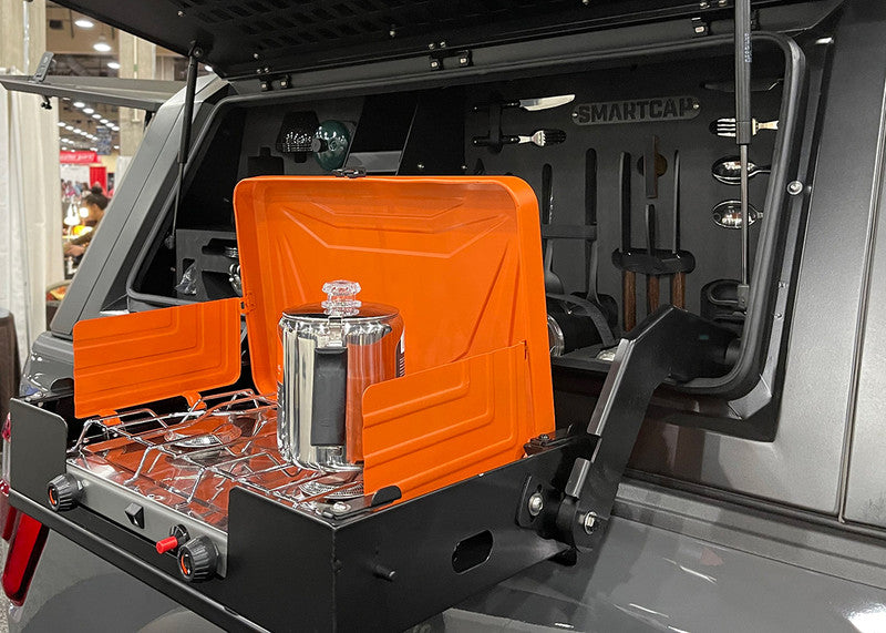 From camping to Overlanding, to tailgating, the Camp Kitchen-Bin turns your truck into a moveable feast. Complete with a fold-out camp stove, cutting board, and secure storage for the included dishes, cookware, and spices. Bon appétit!