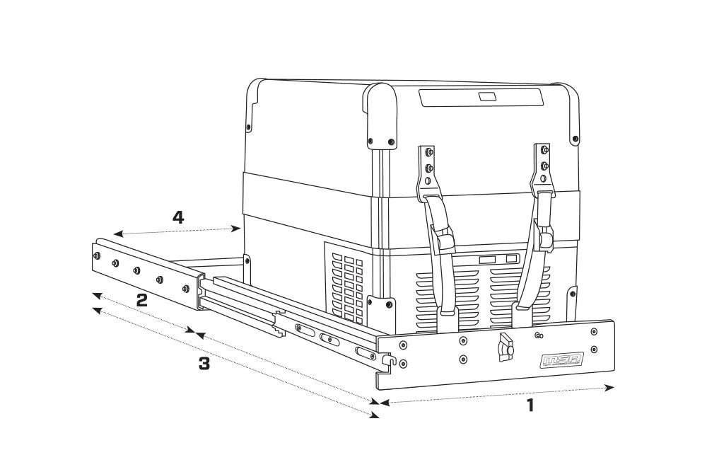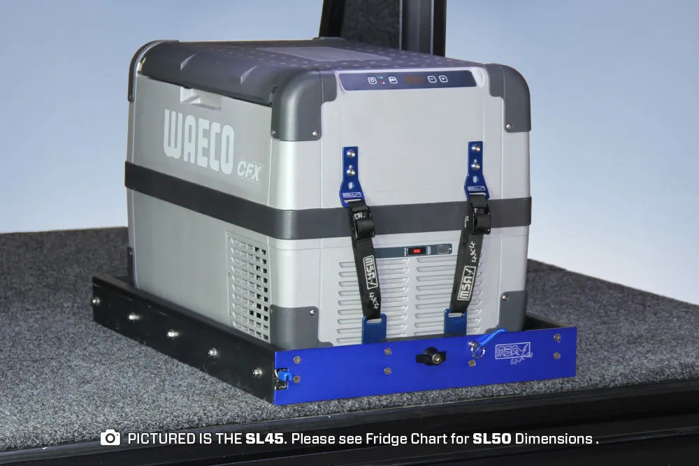 slide-in movement of the fridge. It also allows maximum slide extension, providing greater access to the fridge over the tailgate or rear bar. The unique lock-in and lockout mechanism ensures the slide will stay in its intended position regardless of the angle of the vehicle. Key lock, runner locks and supplied tie down kit ensure the tray and fridge are secure whilst travelling. The uniquely recognisable MSA 4X4 blue anodised faceplate provides a tough, durable and eye-catching finish, which is a standard feature across the range.